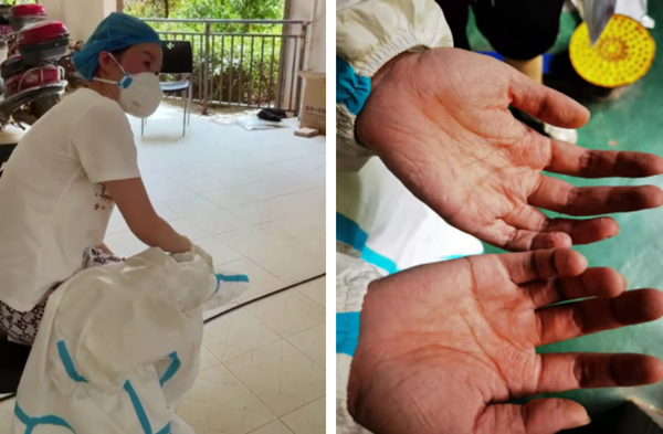 在长沙某小区 ,一名采样人员出现中暑症状;米兰电竞采样人员双手被汗水泡得发白、发皱